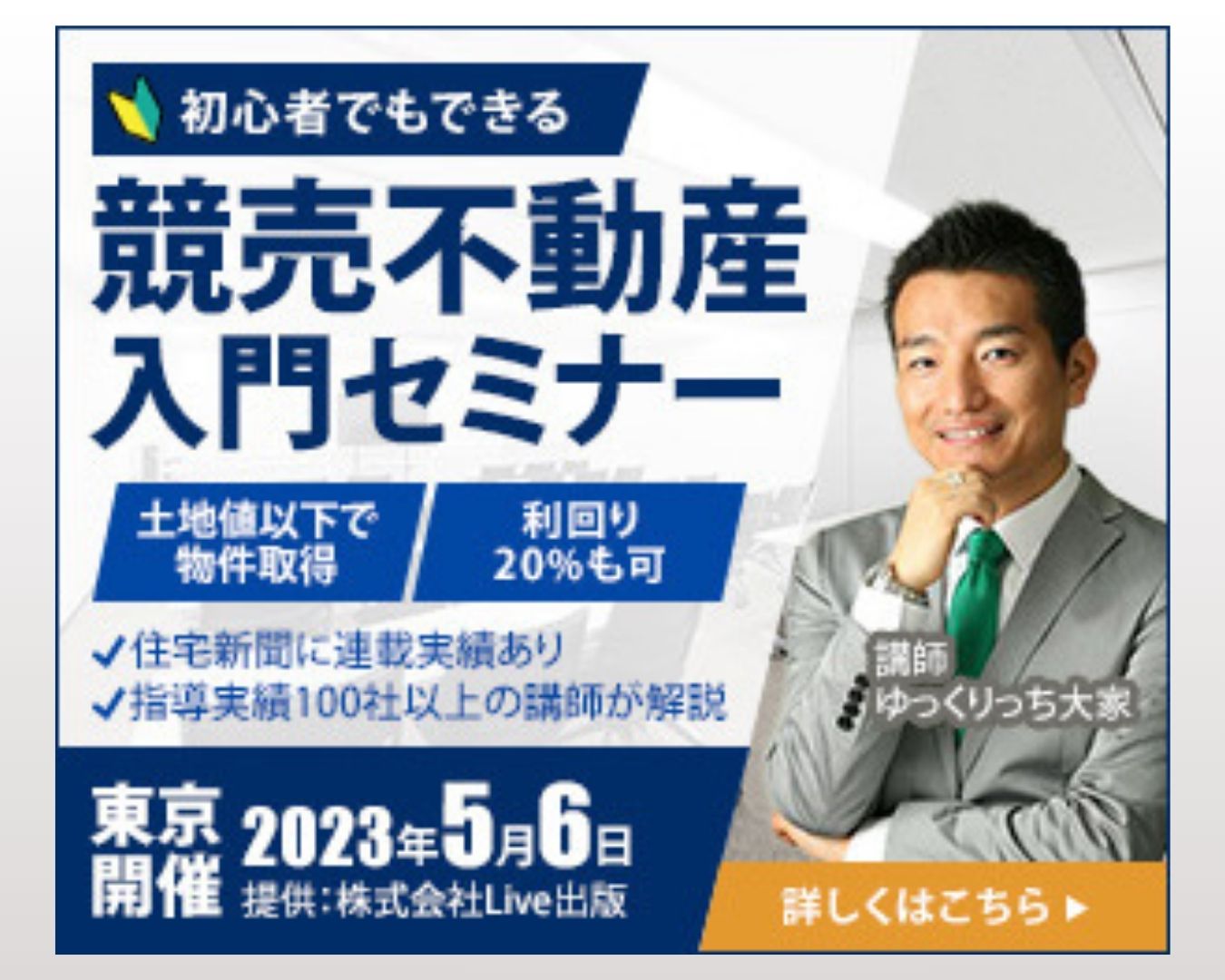 【前提条件】 競売不動産セミナーへの新規集客を目的とした広告用バナー。ターゲットは不動産投資に興味を持ち始めた40〜50代男性。
